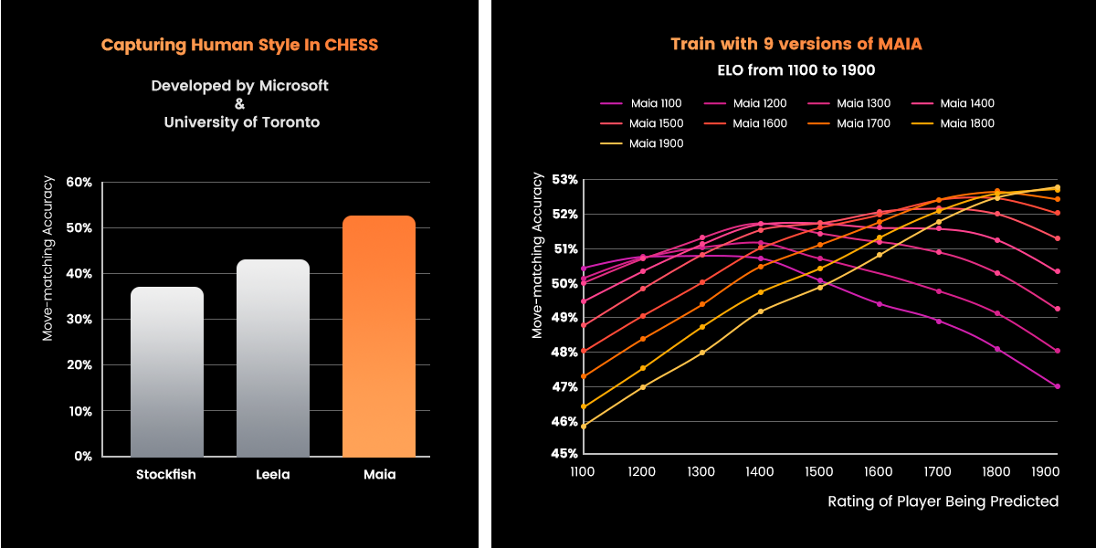 As a result, Maia has a more human-like style than previous engines, matching moves played by human players in online games over 50% of the time.”